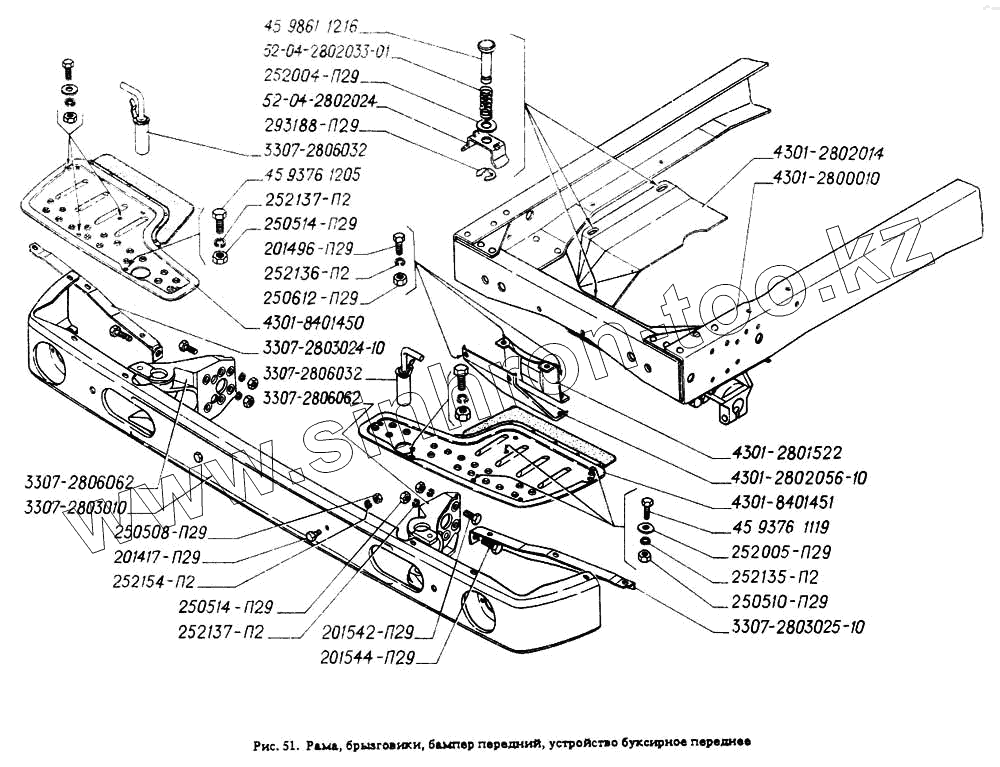 Каталог запасных частей к технике: ГАЗ-4301. Рама, брызговики, бампер передний, устройство буксирное переднее