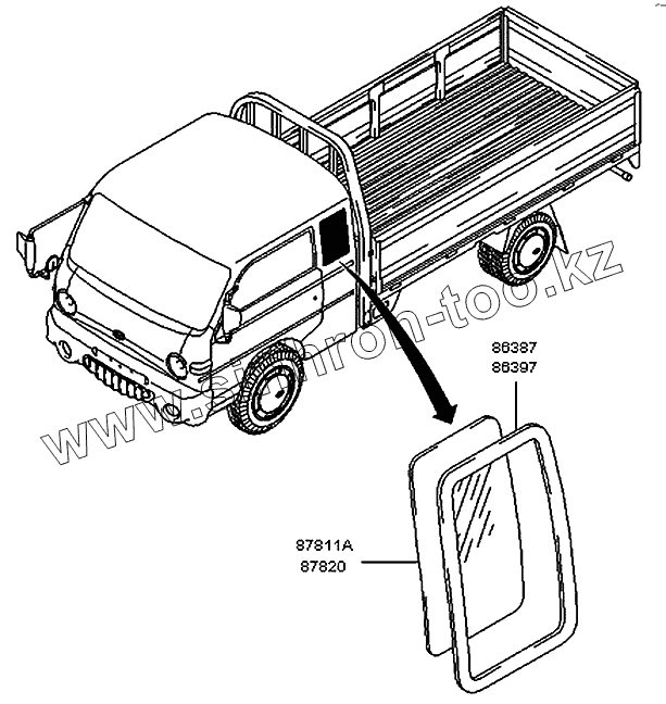 Каталог запасных частей к технике: Hyundai H100 Porter. Стекло боковое