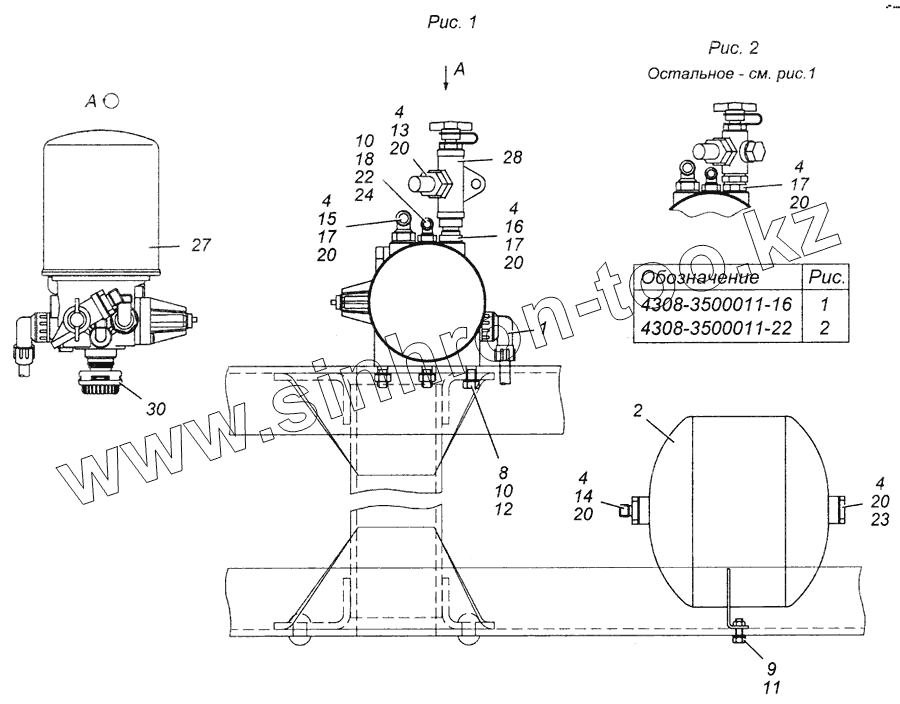 Каталог запасных частей к технике: Камский автозавод 4308. Установка осушителя 4308-3500011-16