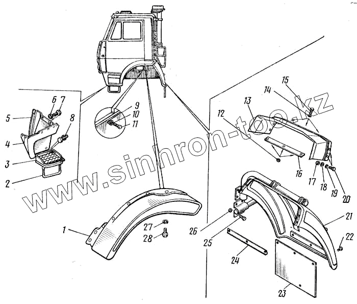 Каталог запасных частей к технике: Камский автозавод 43101. Крыло, брызговик и подножка