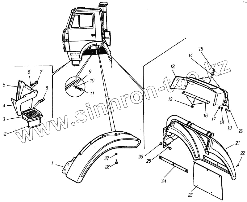 Каталог запасных частей к технике: Камский автозавод 4310. Крыло и брызговик, подножка
