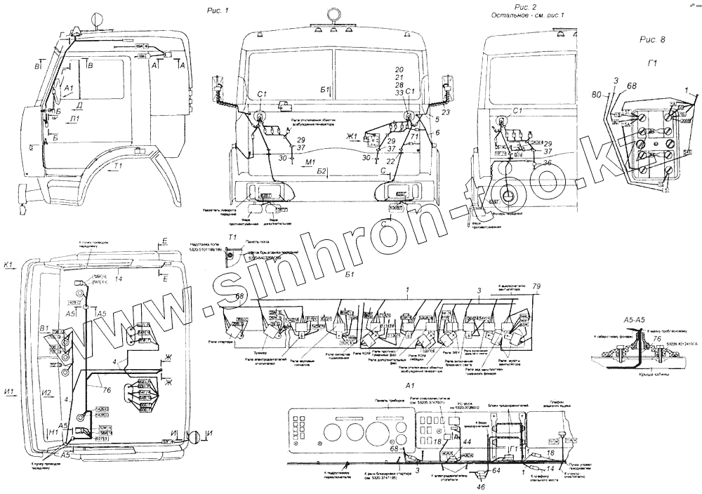 Каталог запасных частей к технике: Камский автозавод 43114. Установка проводов на кабине
