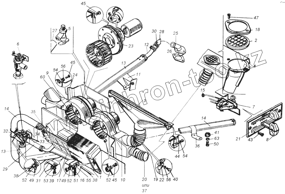 Каталог запасных частей к технике: Камский автозавод 43114. Установка системы отопления