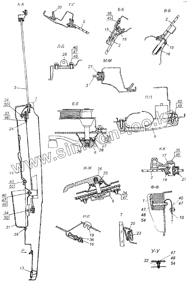 Каталог запасных частей к технике: Камский автозавод 43114. Установка стекол и арматуры двери правая