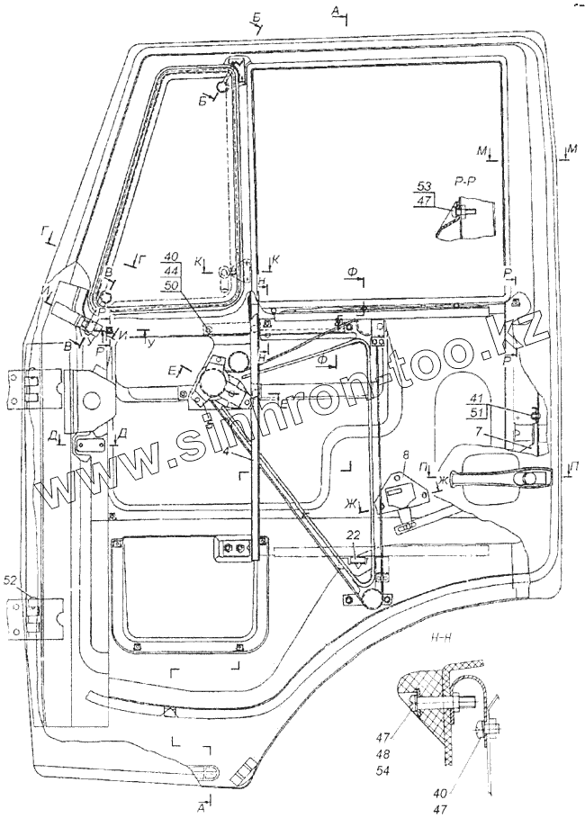 Каталог запасных частей к технике: Камский автозавод 43118. Установка стекол и арматуры двери правая