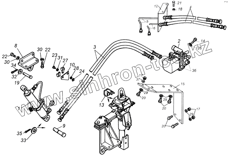 Каталог запасных частей к технике: Камский автозавод 43118. Установка цилиндра и трубопроводов опрокидывающего механизма кабины