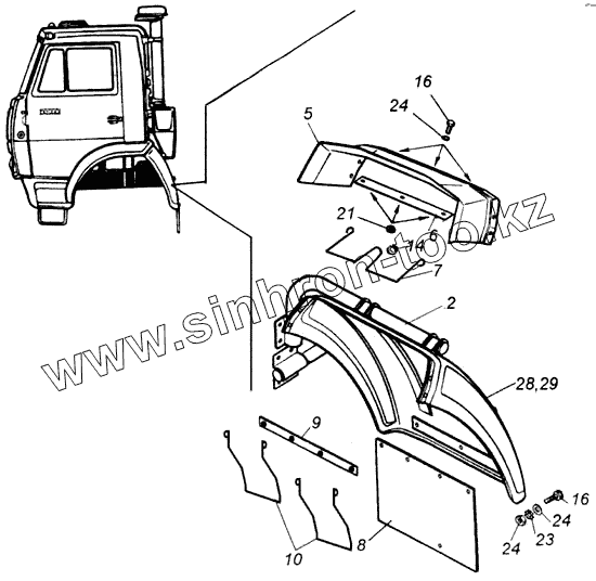 Каталог запасных частей к технике: Камский автозавод 43118. Установка задней части переднего крыла левая