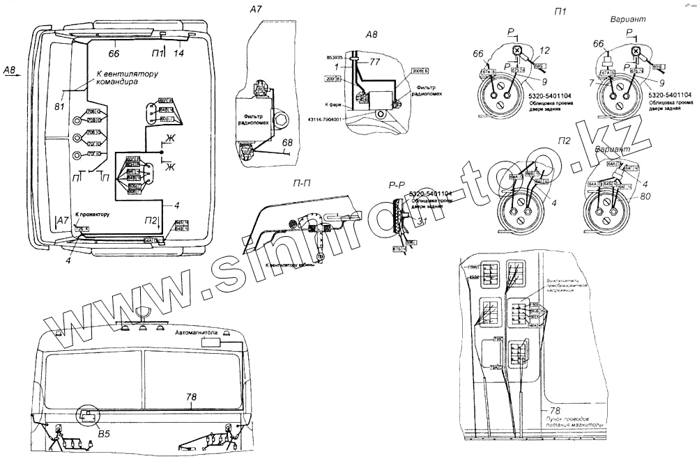 Каталог запасных частей к технике: Камский автозавод 4326. Установка проводов на кабине