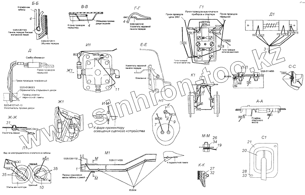 Каталог запасных частей к технике: Камский автозавод 4326. Установка проводов на кабине