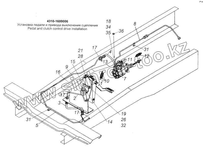 Каталог запасных частей к технике: Камский автозавод 53228, 65111. Установка педали и привода выключения сцепления