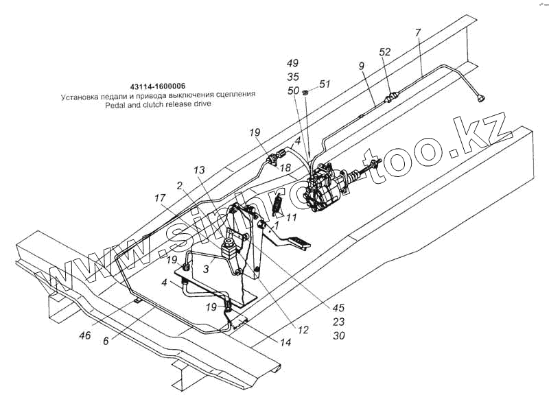 Каталог запасных частей к технике: Камский автозавод 53228, 65111. Установка педали и привода выключения сцепления