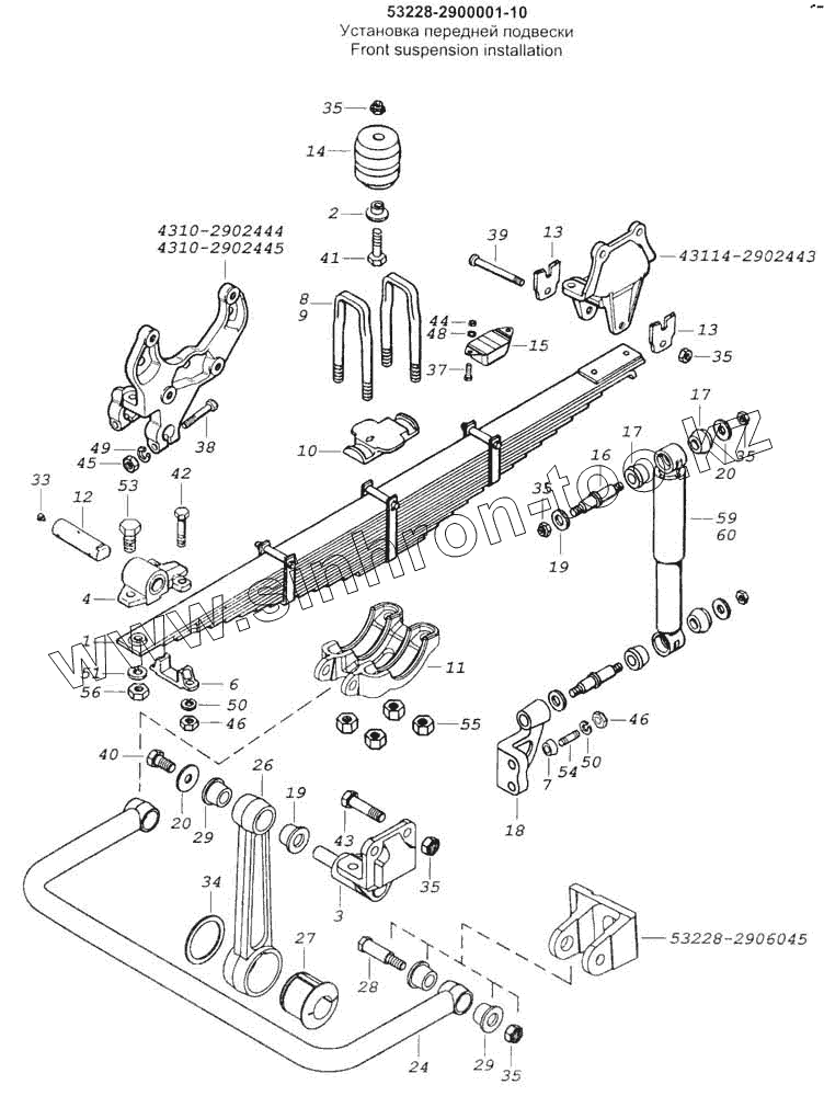Каталог запасных частей к технике: Камский автозавод 53228, 65111. Установка передней подвески
