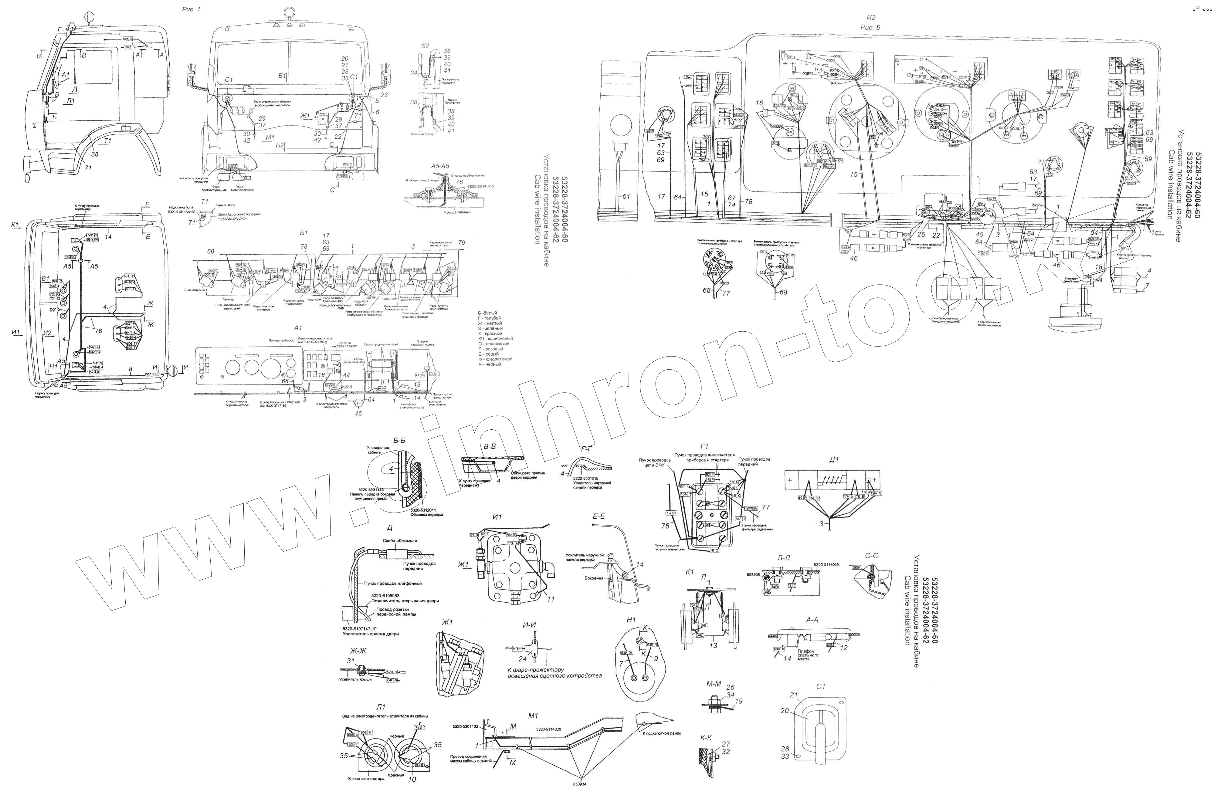 Каталог запасных частей к технике: Камский автозавод 53228, 65111. Установка проводов на кабине