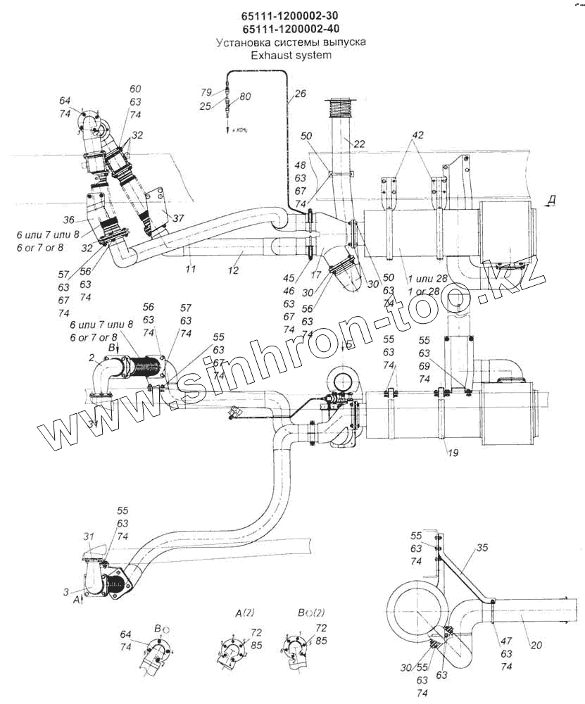 Каталог запасных частей к технике: Камский автозавод 53228, 65111. Установка системы выпуска