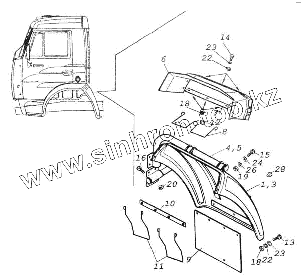Каталог запасных частей к технике: Камский автозавод 53228, 65111. Установка задней части переднего крыла правая