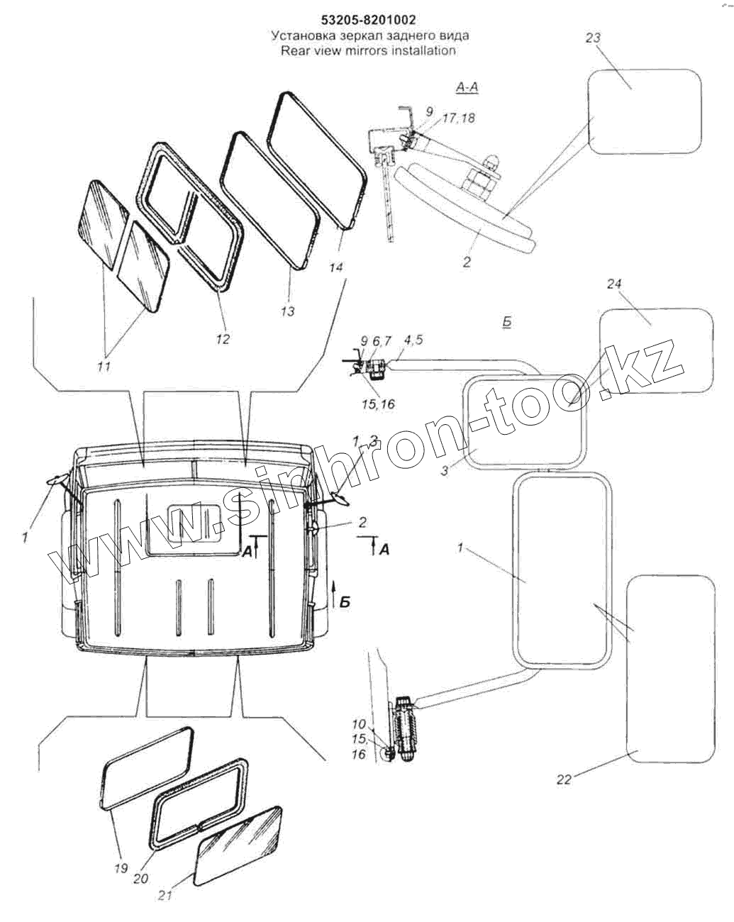 Каталог запасных частей к технике: Камский автозавод 53228, 65111. Установка зеркал заднего вида