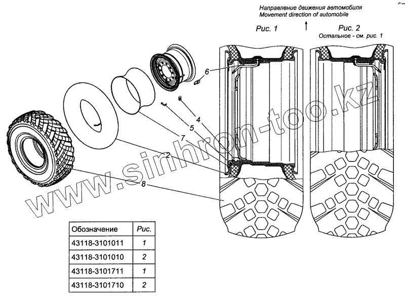 Каталог запасных частей к технике: Камский автозавод 53501 (6х6). 43118-3101011 Колесо с шиной левое