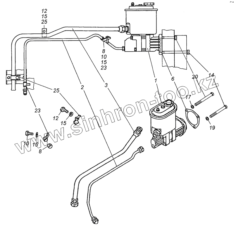 Каталог запасных частей к технике: Камский автозавод 53501 (6х6). 7406.3407001 Установка насоса гидроусилителя руля