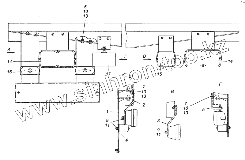 Каталог запасных частей к технике: Камский автозавод 53504 (6х6). 6350-3716002 Установка задних фонарей