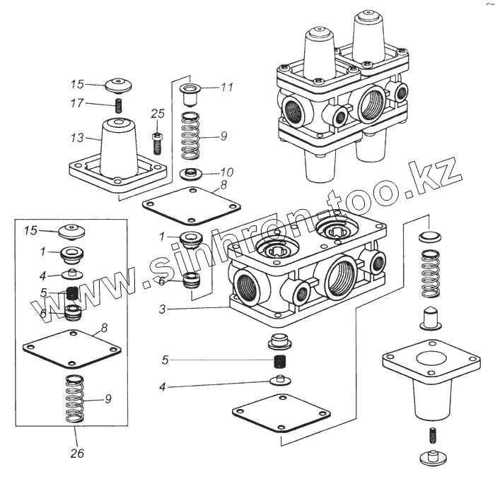 Каталог запасных частей к технике: Камский автозавод 5360. Клапан защитный четырехконтурный