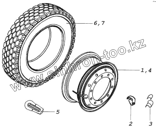Каталог запасных частей к технике: Камский автозавод 5360. Колесо 9.00x22.5 стальное с шиной