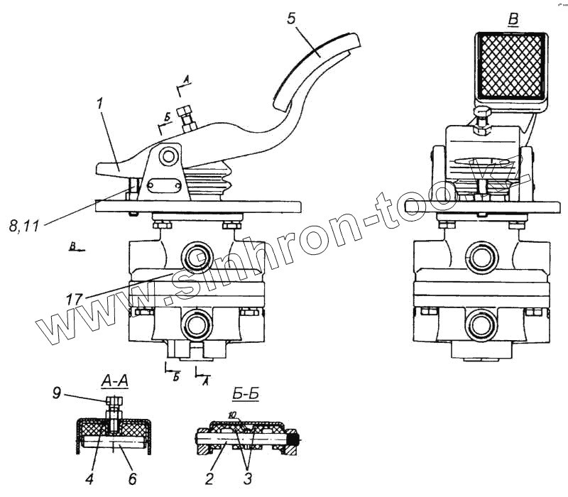 Каталог запасных частей к технике: Камский автозавод 5360. Кран тормозной двухсекционный с педалью