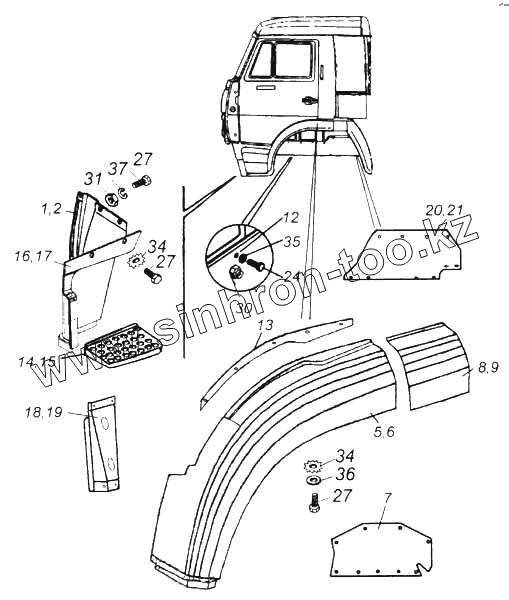 Каталог запасных частей к технике: Камский автозавод 5360. Установка оперения кабины