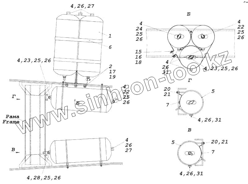 Каталог запасных частей к технике: Камский автозавод 5360. Установка воздушных ресиверов