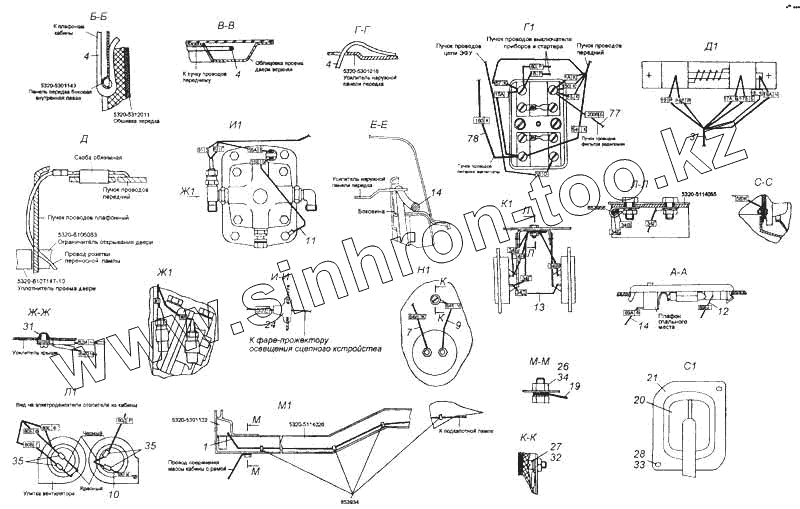 Каталог запасных частей к технике: Камский автозавод 5460. Установка проводов на кабине