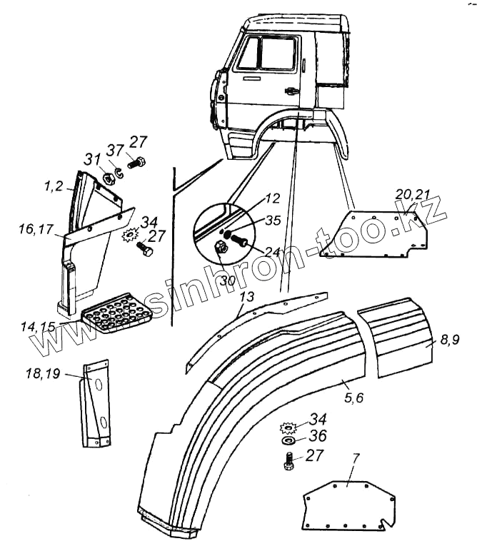 Каталог запасных частей к технике: Камский автозавод 5460. Установка оперения кабины