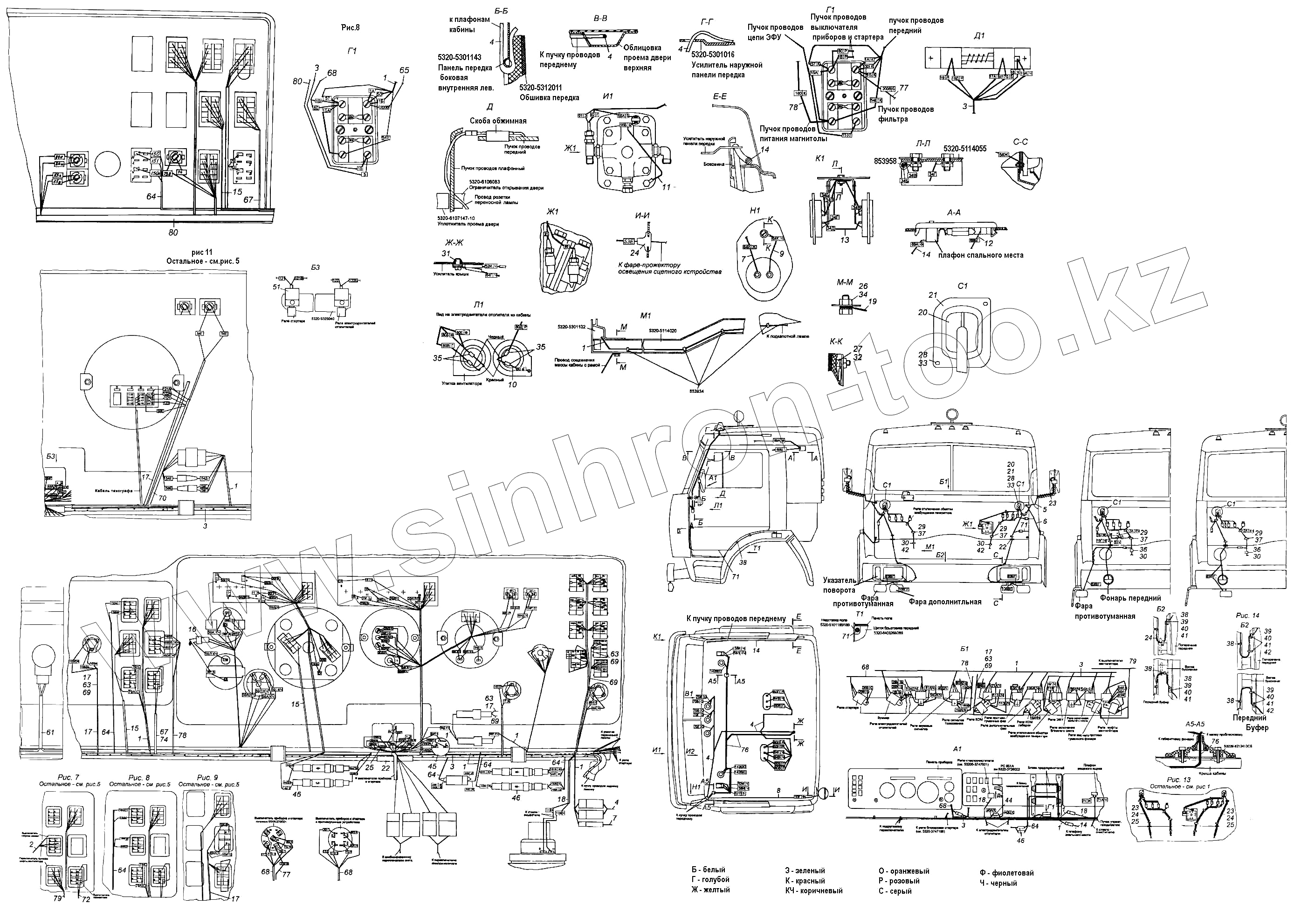 Каталог запасных частей к технике: Камский автозавод 5460. Установка проводов на кабине