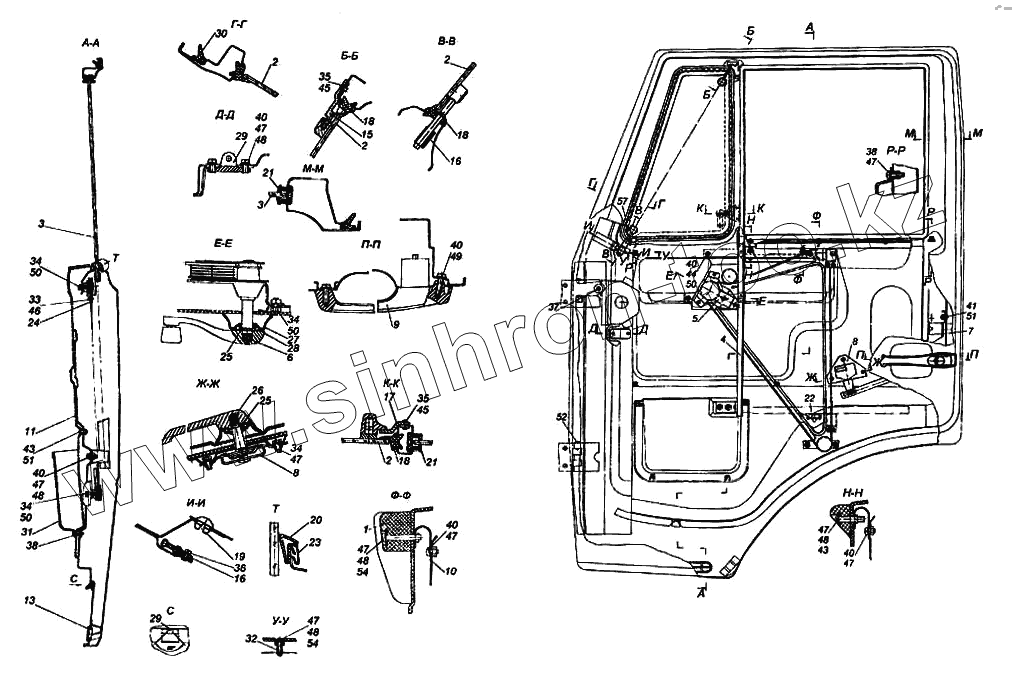 Каталог запасных частей к технике: Камский автозавод 5460. Установка стекол и арматуры двери
