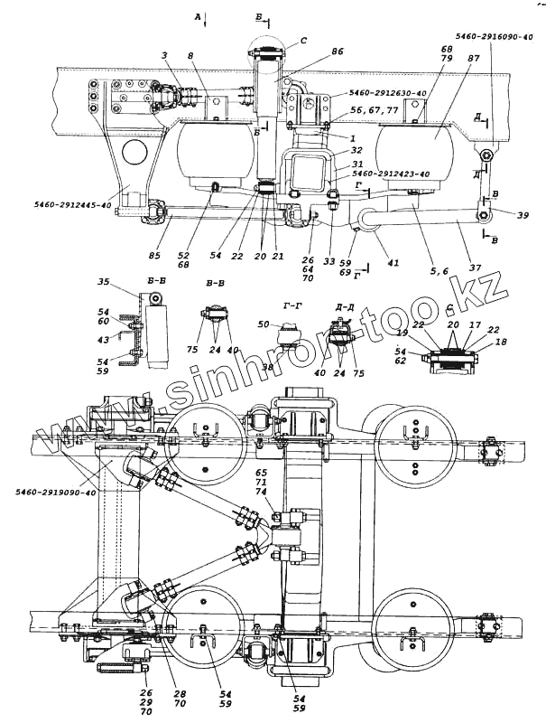 Каталог запасных частей к технике: Камский автозавод 5460. Установка задней подвески (Усовершенствованная конструкция)