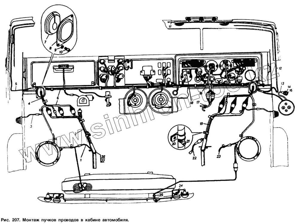 Каталог запасных частей к технике: Камский автозавод 55102. Монтаж пучков проводов в кабине автомобиля