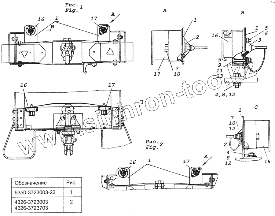 Каталог запасных частей к технике: Камский автозавод 6350 (8х8). 6350-3723003-22 Установка розеток прицепа