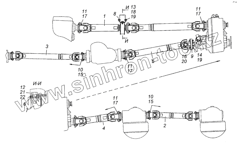 Каталог запасных частей к технике: Камский автозавод 6450 (8х8). 6350-2200001-10 Установка карданных валов