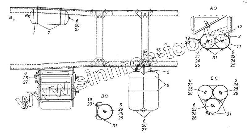 Каталог запасных частей к технике: Камский автозавод 6450 (8х8). 6350-3500013 Установка воздушных ресиверов