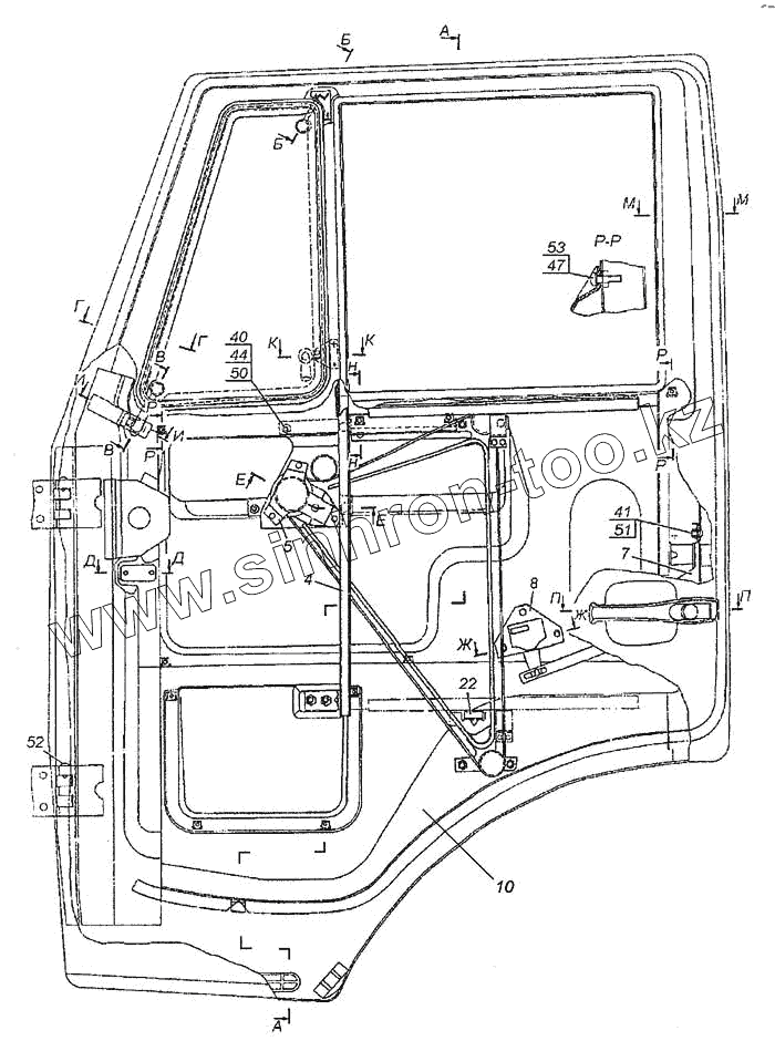Каталог запасных частей к технике: Камский автозавод 6460. Установка стекол и арматуры двери правая/левая