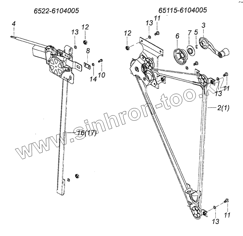 Каталог запасных частей к технике: Камский автозавод 6460 (Евро 4). 65115-6104005 Установка стеклоподъемников двери