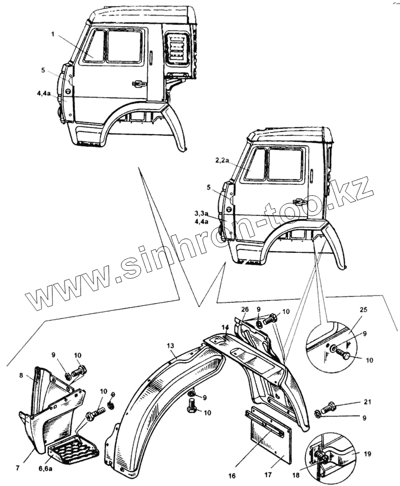 Каталог запасных частей к технике: Камский автозавод 65115. Крыло, брызговик и подножка