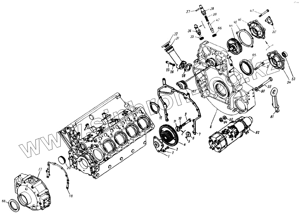 Каталог запасных частей к технике: Камский автозавод 65115. Установка картера маховика и крышки блока передней