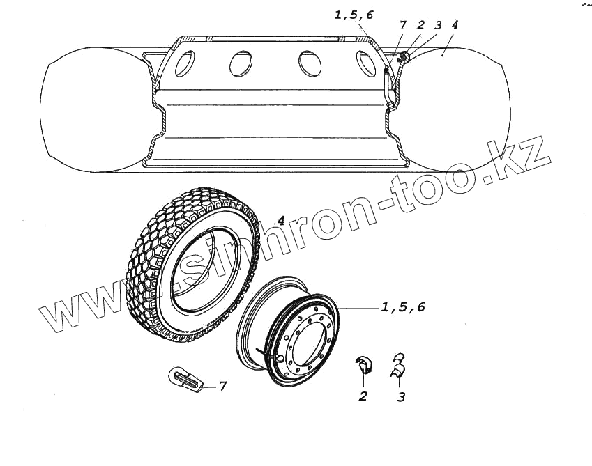 Каталог запасных частей к технике: Камский автозавод 65116. Колесо 8,25х22,5 стальное с шиной