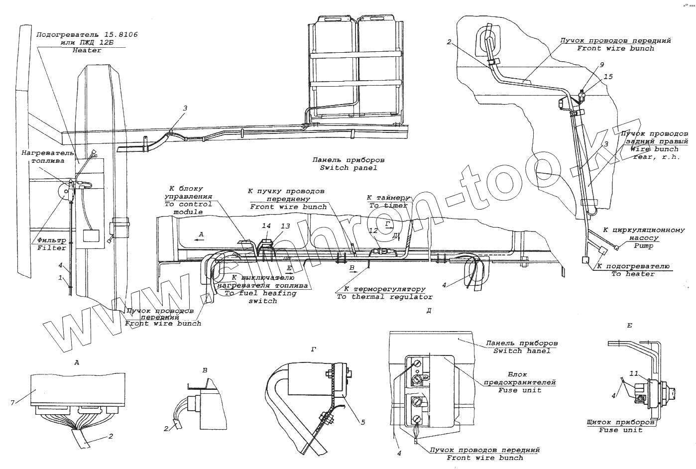 Каталог запасных частей к технике: Камский автозавод 65116. Установка электрооборудования подогревателя