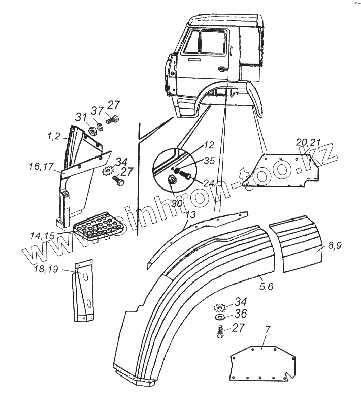 Каталог запасных частей к технике: Камский автозавод 65116. Установка оперения кабины