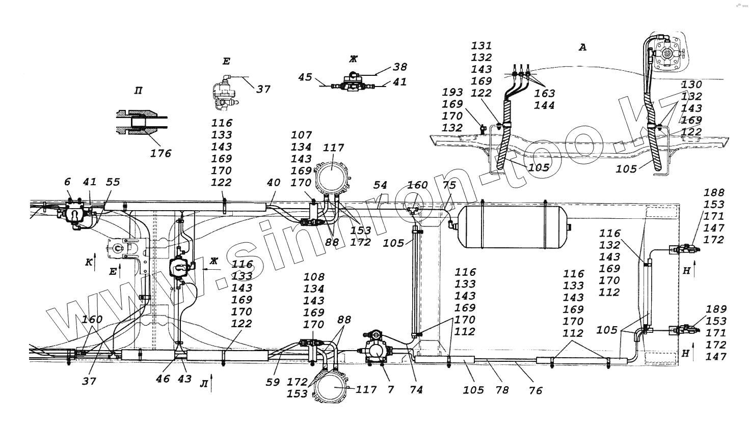 Каталог запасных частей к технике: Камский автозавод 65116. Установка пневмопривода тормозов