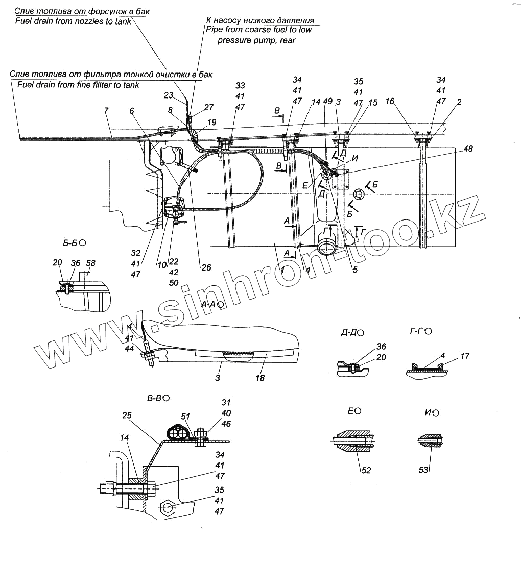 Каталог запасных частей к технике: Камский автозавод 65116. Установка топливного бака, ФГОТ и топлипроводов