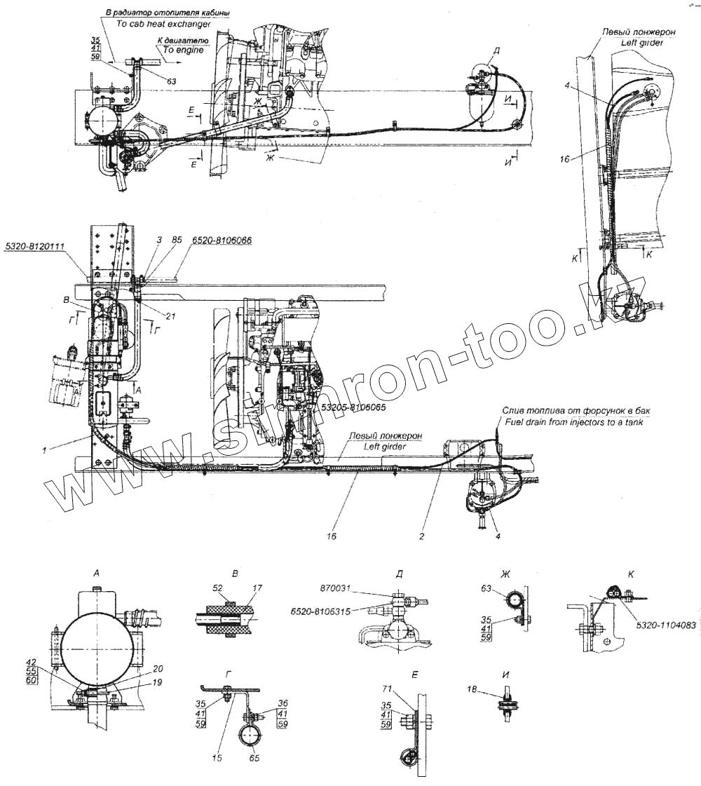 Каталог запасных частей к технике: Камский автозавод 6520. Установка подогревателя 15.8106