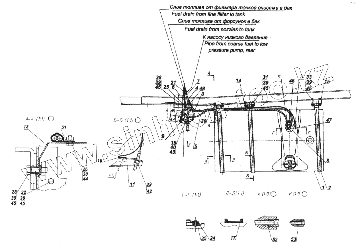 Каталог запасных частей к технике: Камский автозавод 6520. Установка топливного бака, ФГОТ и топливопроводов