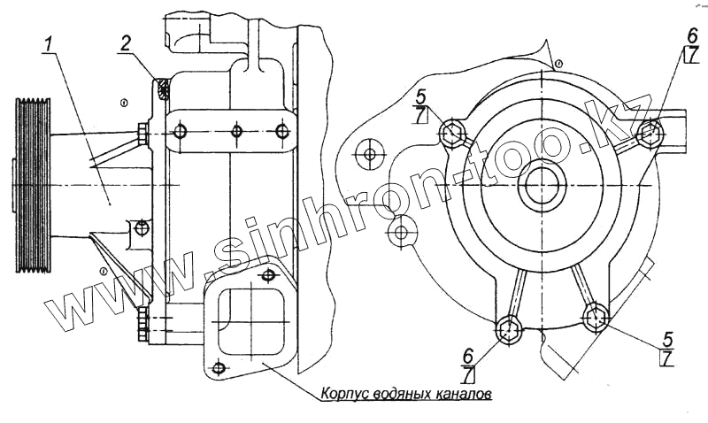 Каталог запасных частей к технике: Камский автозавод 6520. Установка водяного насоса