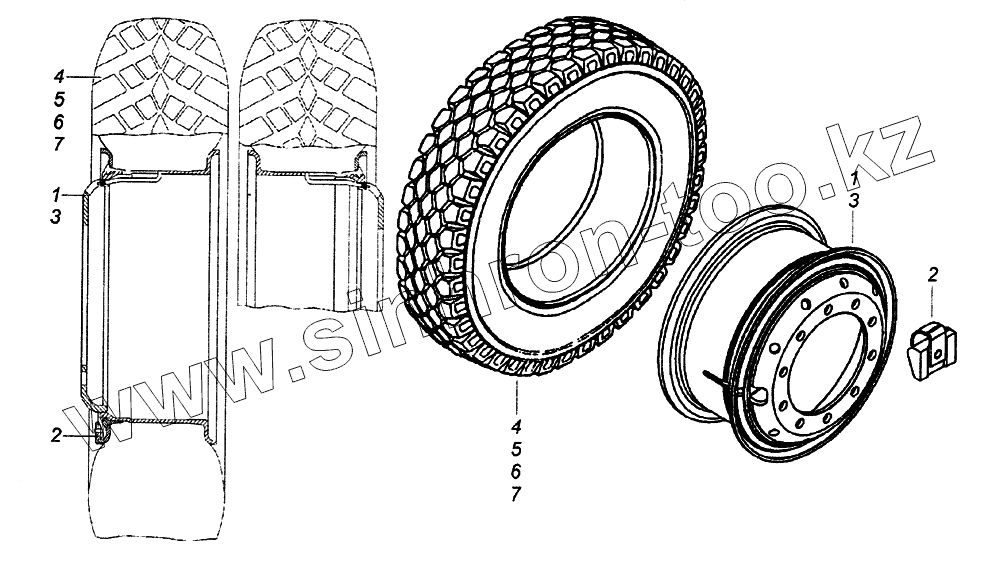 Каталог запасных частей к технике: Камский автозавод 65226. Колесо 8,5-20 с шиной левое